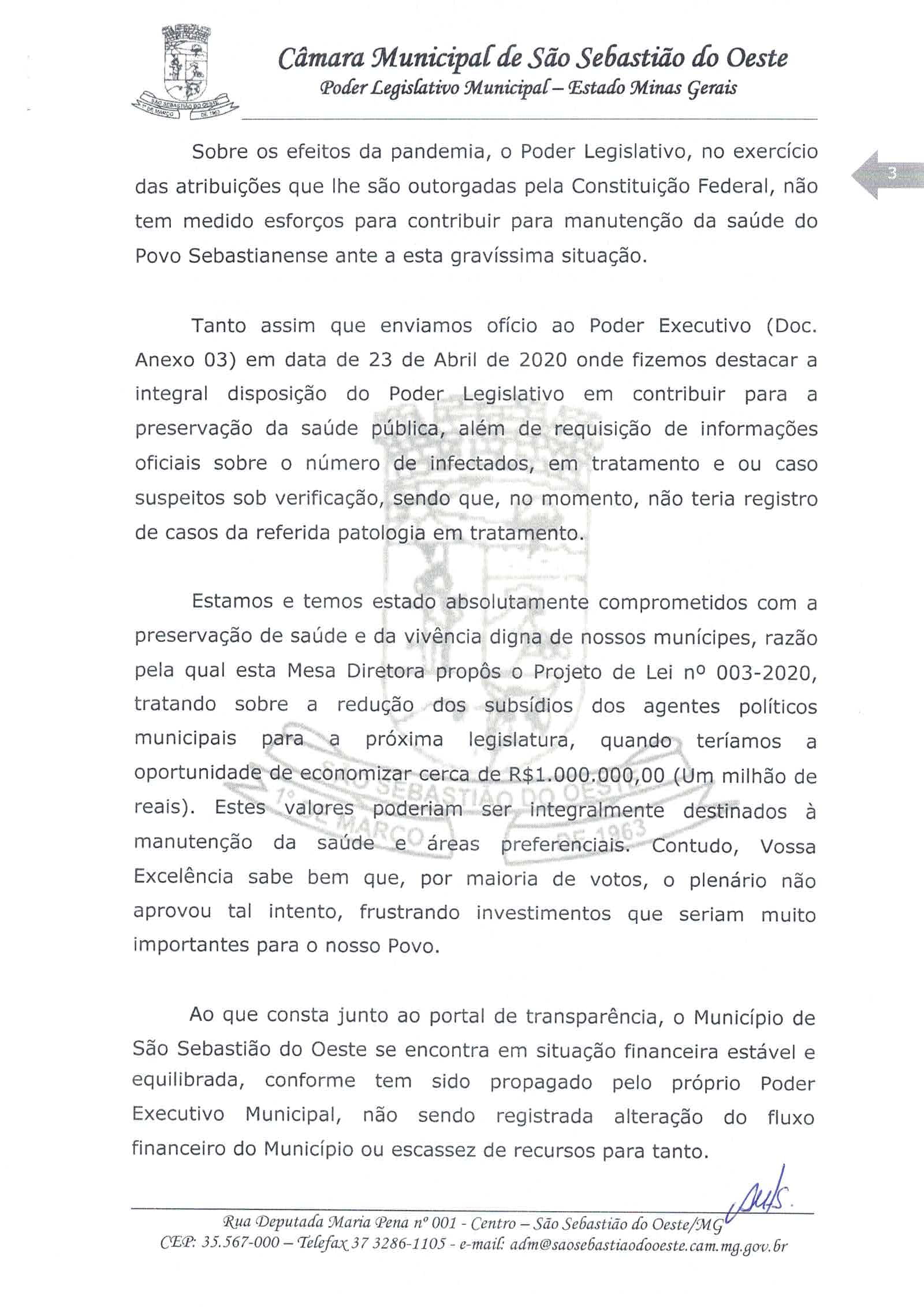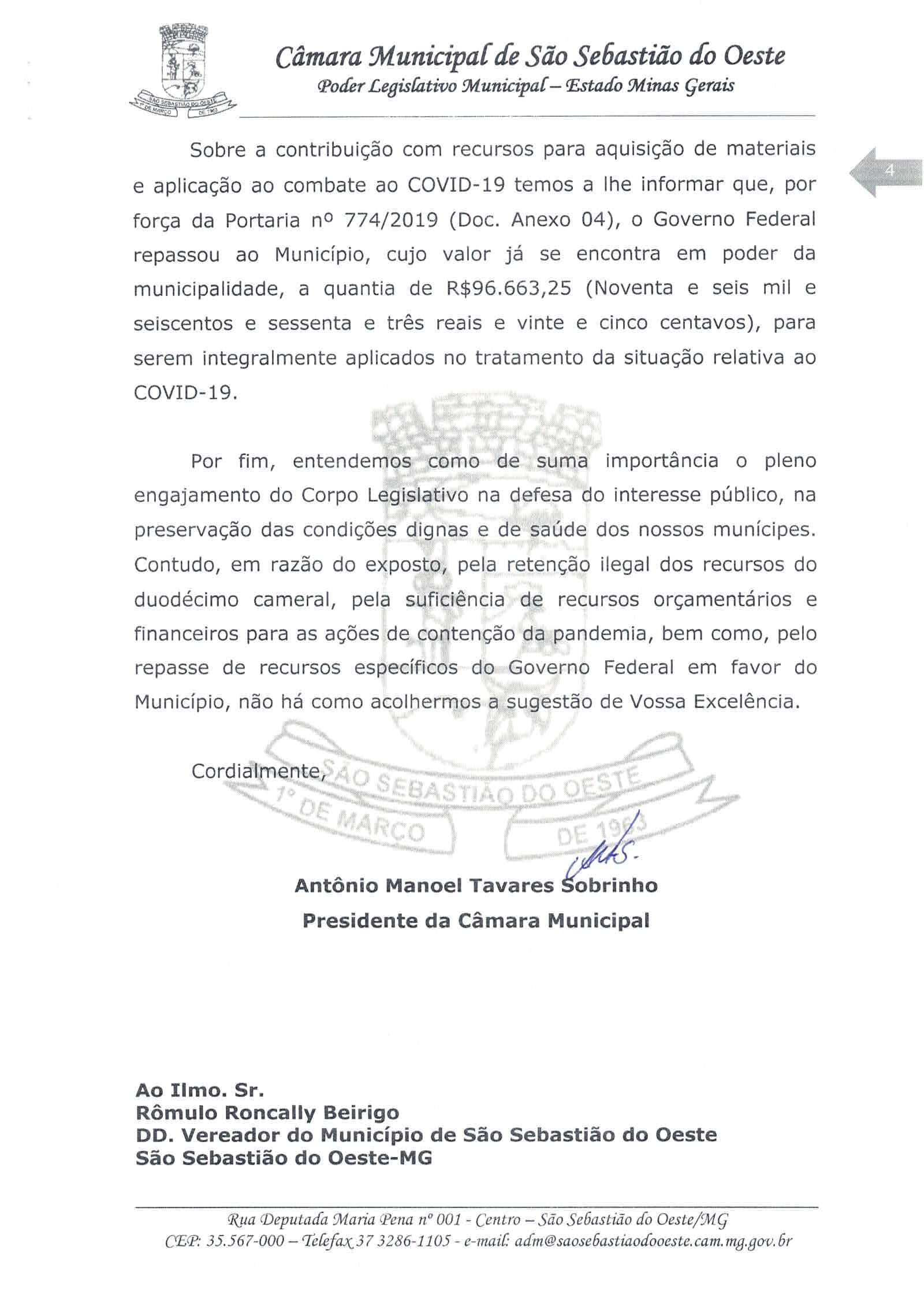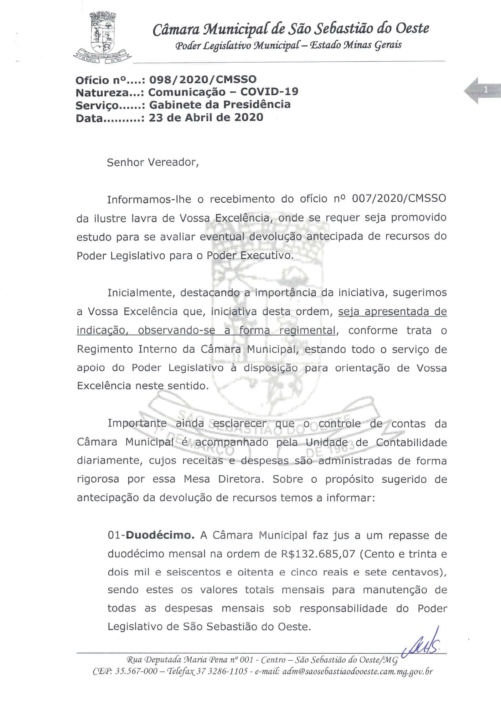 Ofício nº 098/2020/CMSSO - Natureza: Comunicação COVID-19 - Comunicação: Gabinete da Presidência - Data: 23 de Abril de 2020.